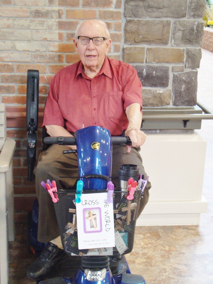 As Don simply tells it, he rides his motorized cart, fully equipped with His love (and our crosses), to the entrance of the Little Falls Care Center, (managed by St. Francis Health Service located in Morris, MN) every afternoon around 2 and sits at the front door for about an hour and a half. During that time, no one can miss the dedicated ‘official greeter’ with his warm smile. Pleasantly, he asks the gentle question, ‘Would you like a cross?’ and THAT’S when the magic begins to happen as the cross passes from the cart’s basket to the hands of the eager recipient. You can almost feel the electricity of God’s love as it dances across that invisible string from Don’s hands to the waiting heart!