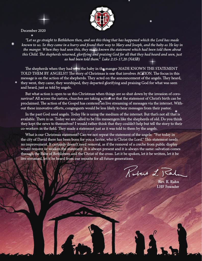 Merry Christmas to you all … Dec25 We thank Rev. Robert Rahn of the Lutheran Heritage Foundation for sharing his Christmas message with us. Share this: Click to print (Opens in new window) Print Click to email a link to a friend (Opens in new window) Email Click to share on Facebook (Opens in new window) Facebook More Click to share on Pinterest (Opens in new window) Pinterest Click to share on Tumblr (Opens in new window) Tumblr Click to share on Pocket (Opens in new window) Pocket Click to share on Reddit (Opens in new window) Reddit Click to share on LinkedIn (Opens in new window) LinkedIn Click to share on X (Opens in new window) X Like Loading... Related